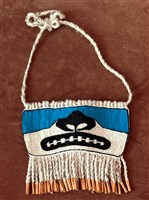 Lily Hope (Tlingit, Raven moiety), Chilkat Protector Mask, 2020. Merino wool, natural dye, cedar bark and tin cones, 7 × 8 ¼ in.