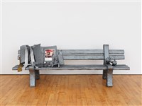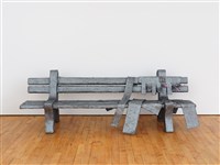 Kianja Strobert (American), Untitled #4, 2025. Wood, plastic, lathe, paper mâché, ink, acrylic paint, paper, wire, 32 × 96 ½ × 26 in.