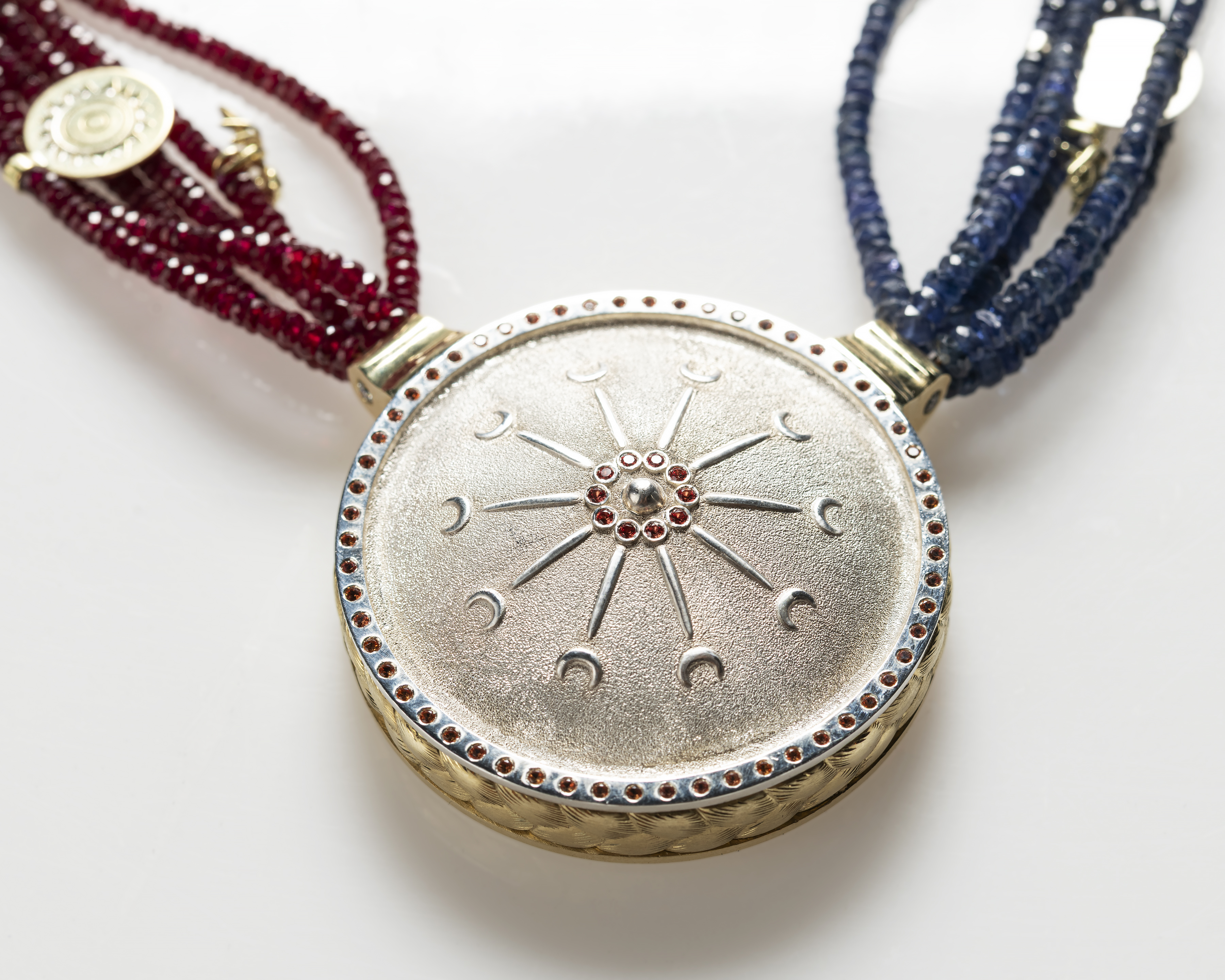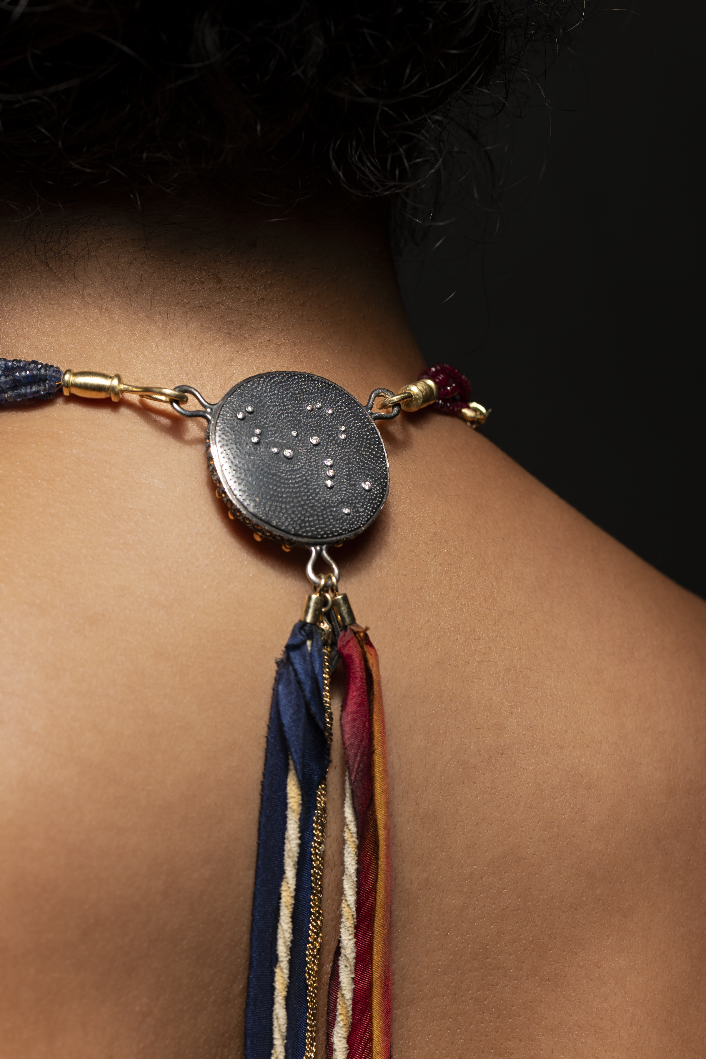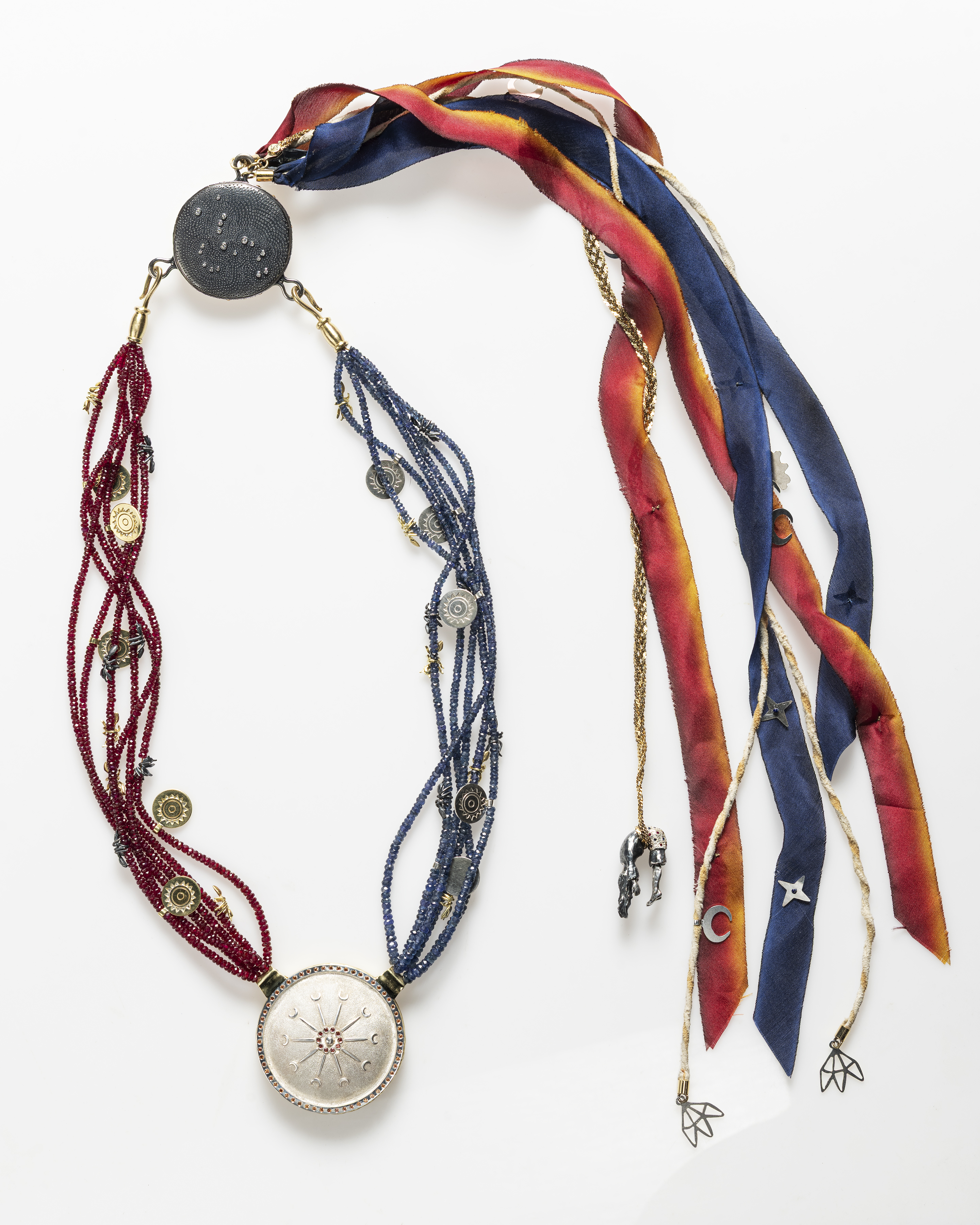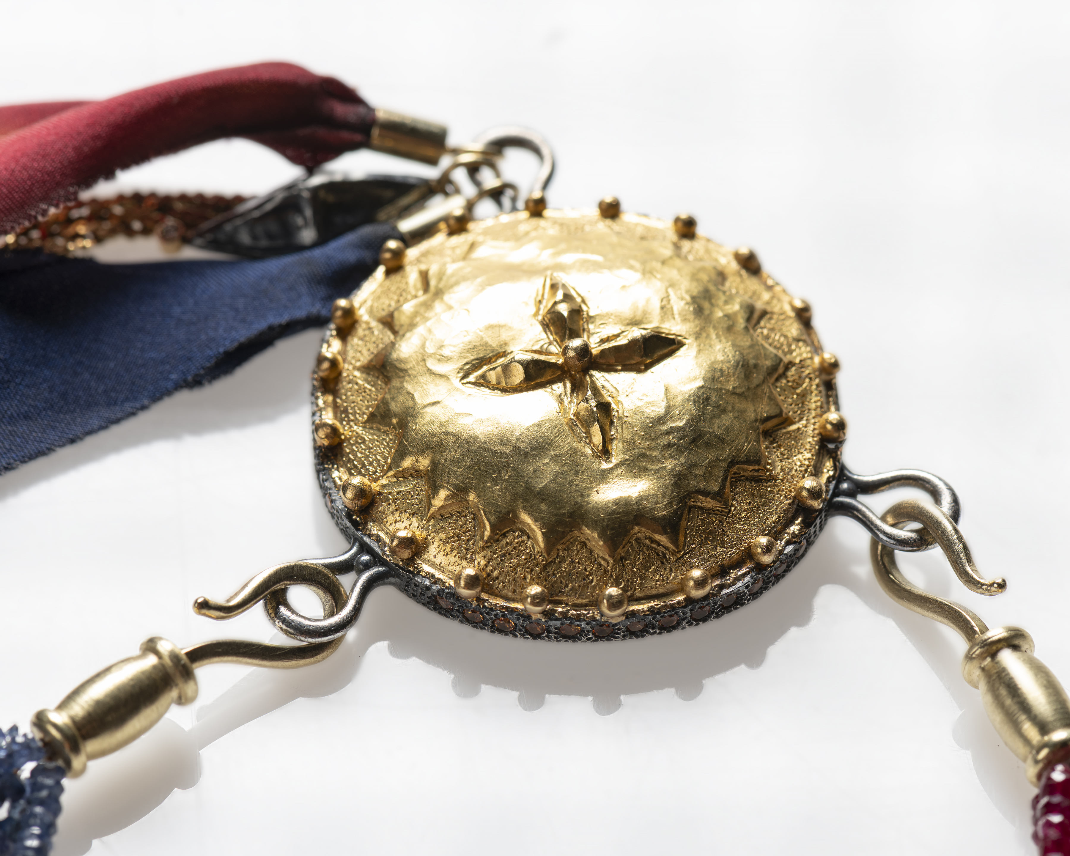 22k gold, 18k gold, sterling silver, sapphires, diamonds, quartz, brain tanned smoked buckskin, hand dyed silk, and rubies