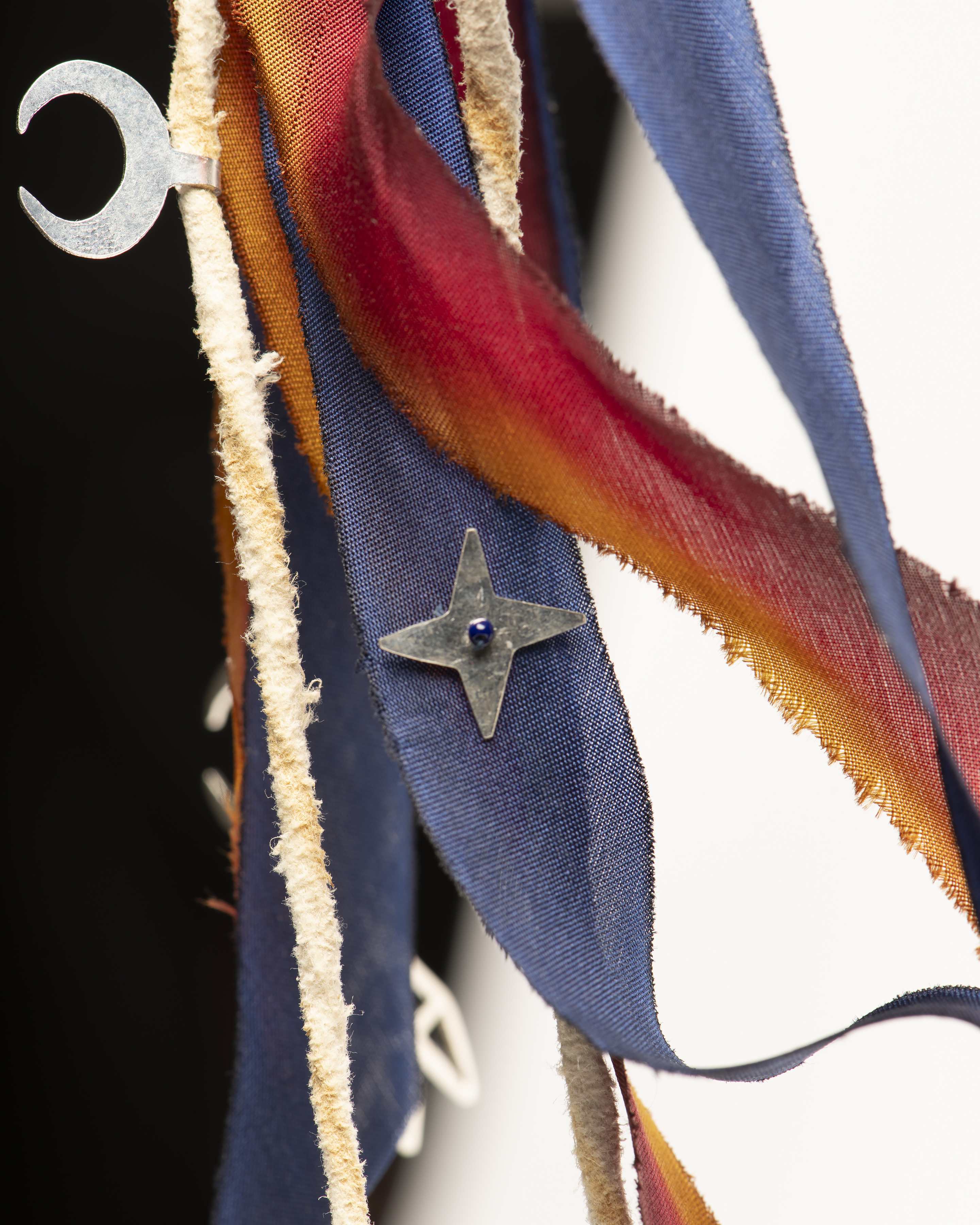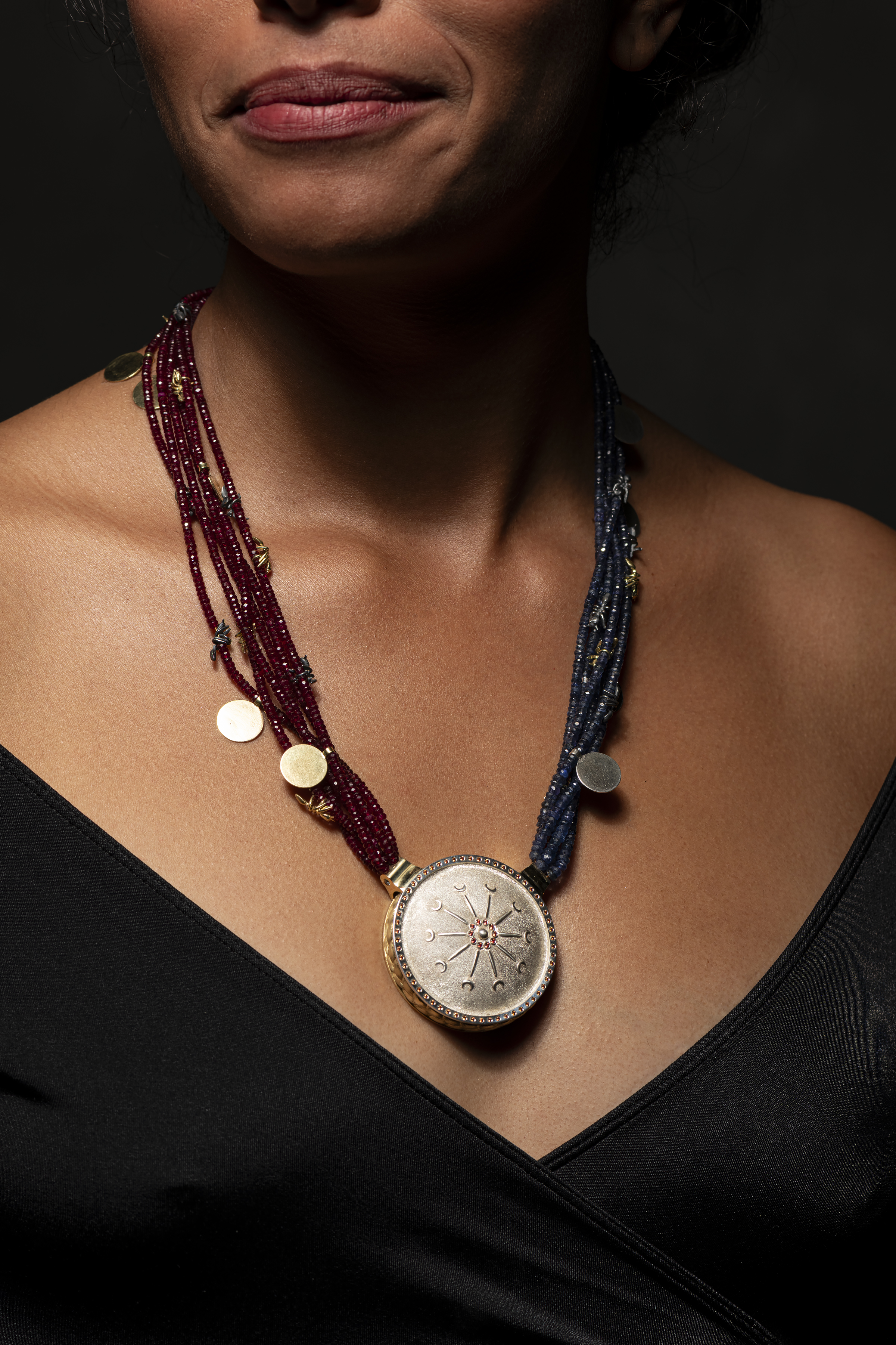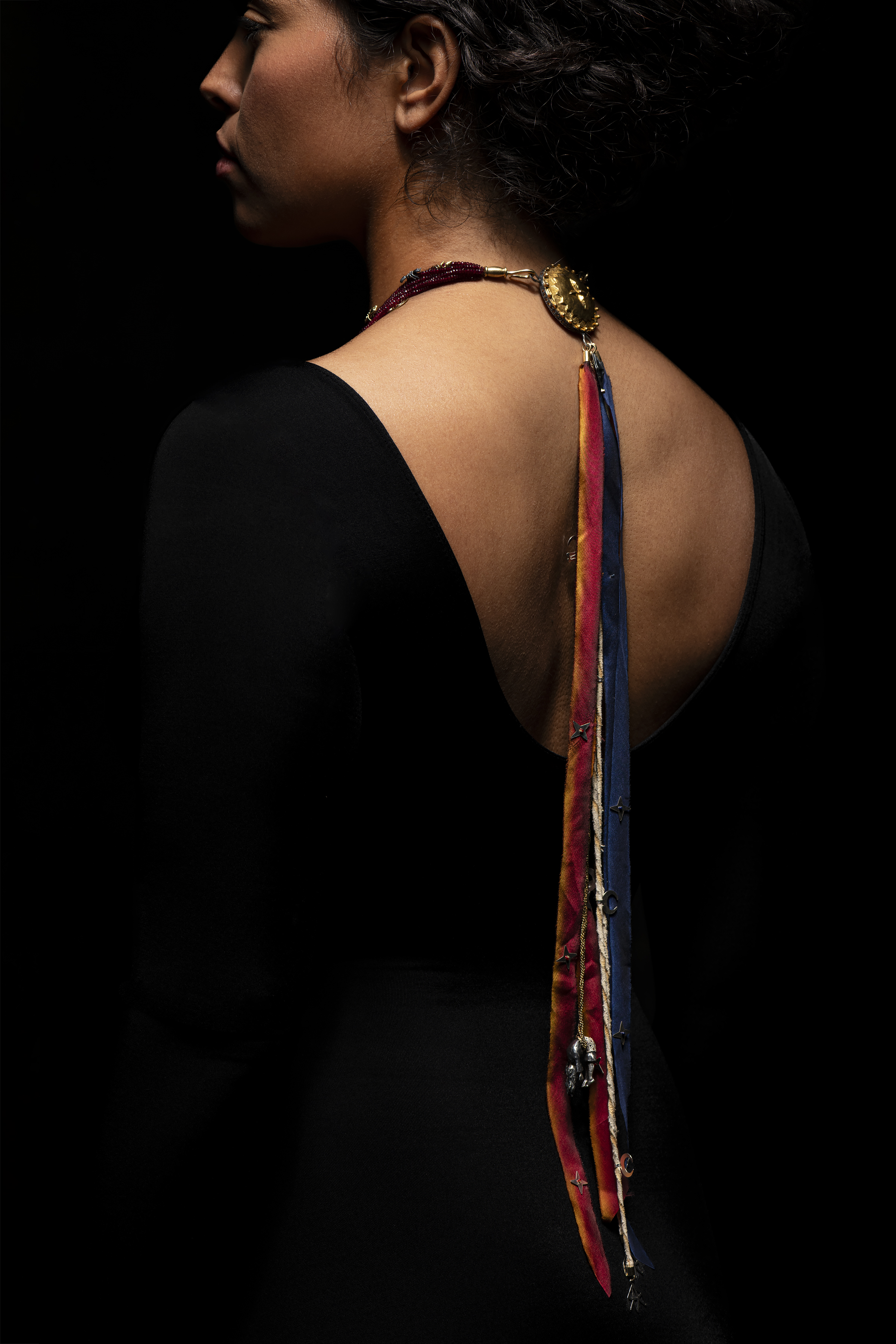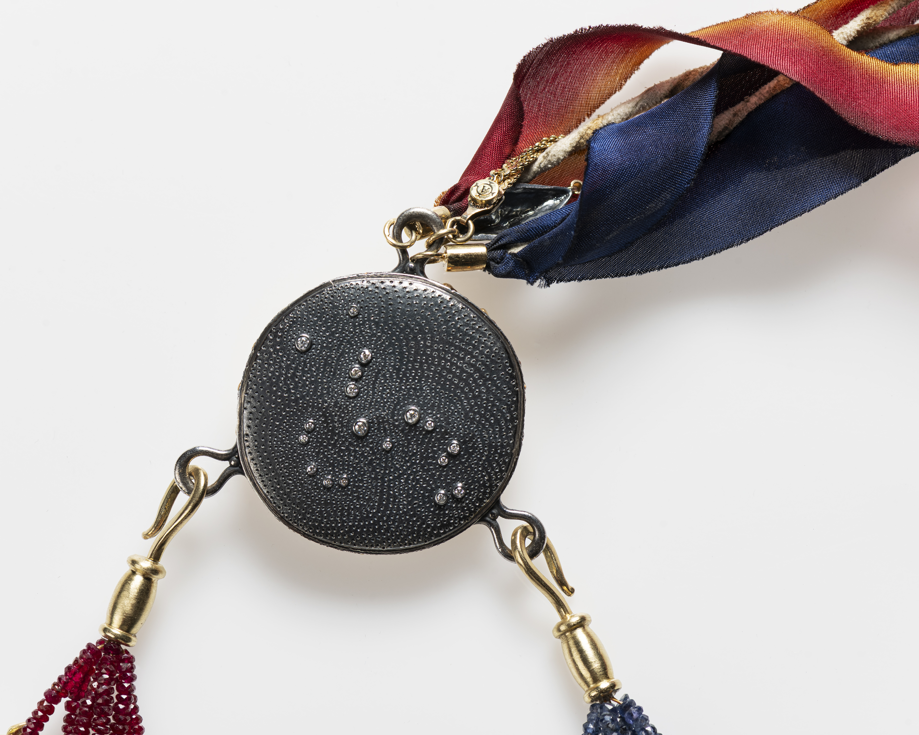22k gold, 18k gold, sterling silver, sapphires, diamonds, quartz, brain tanned smoked buckskin, hand dyed silk, and rubies