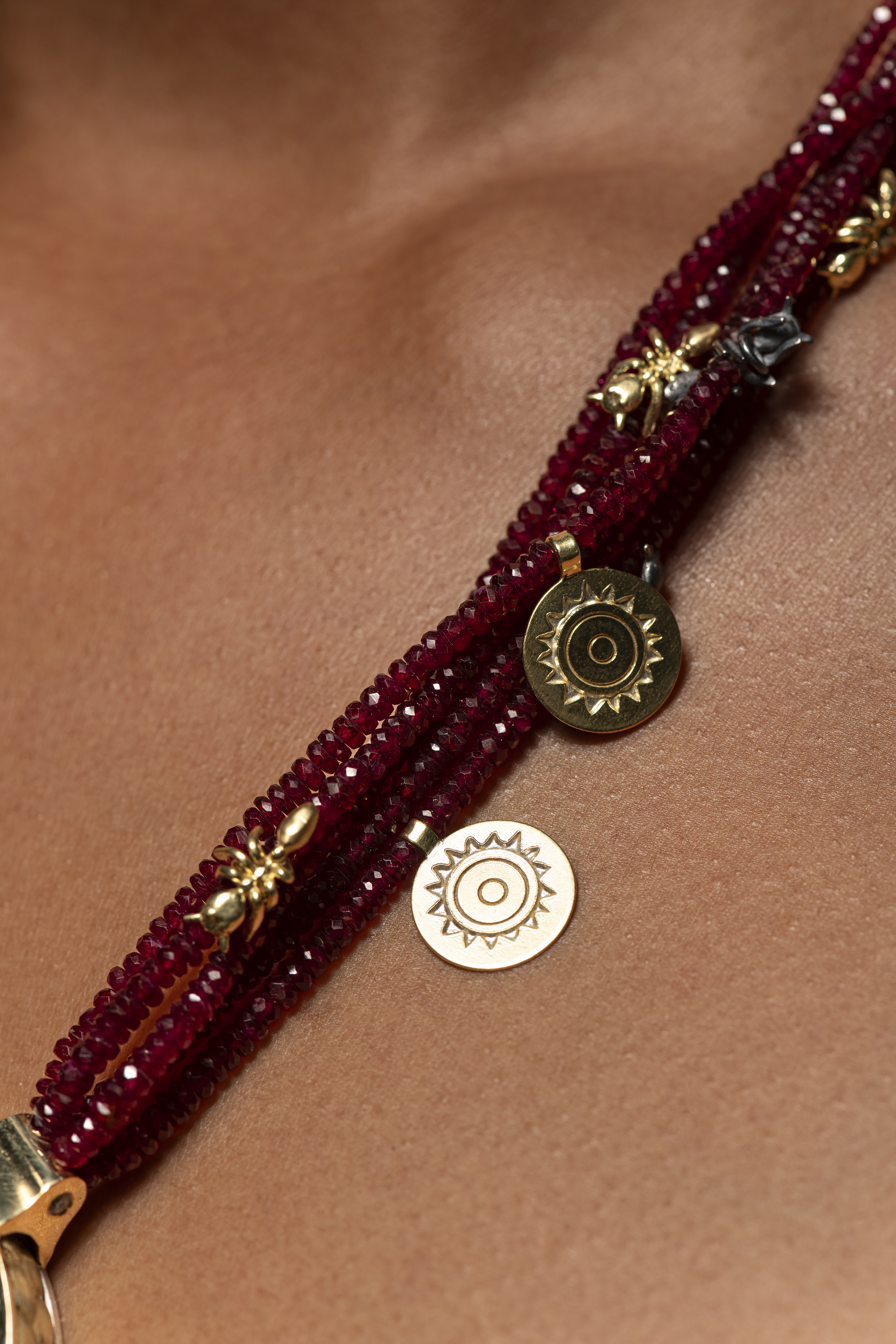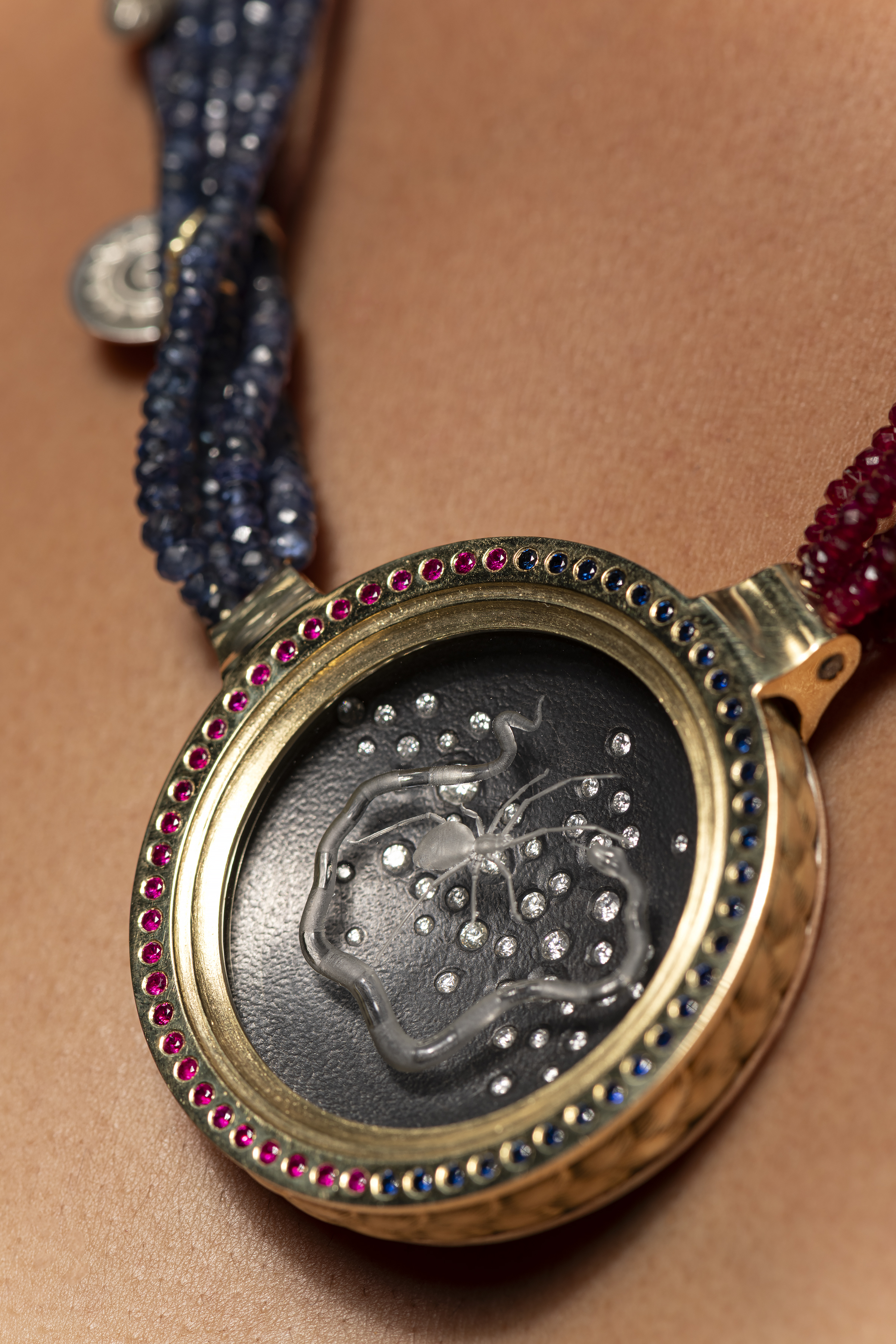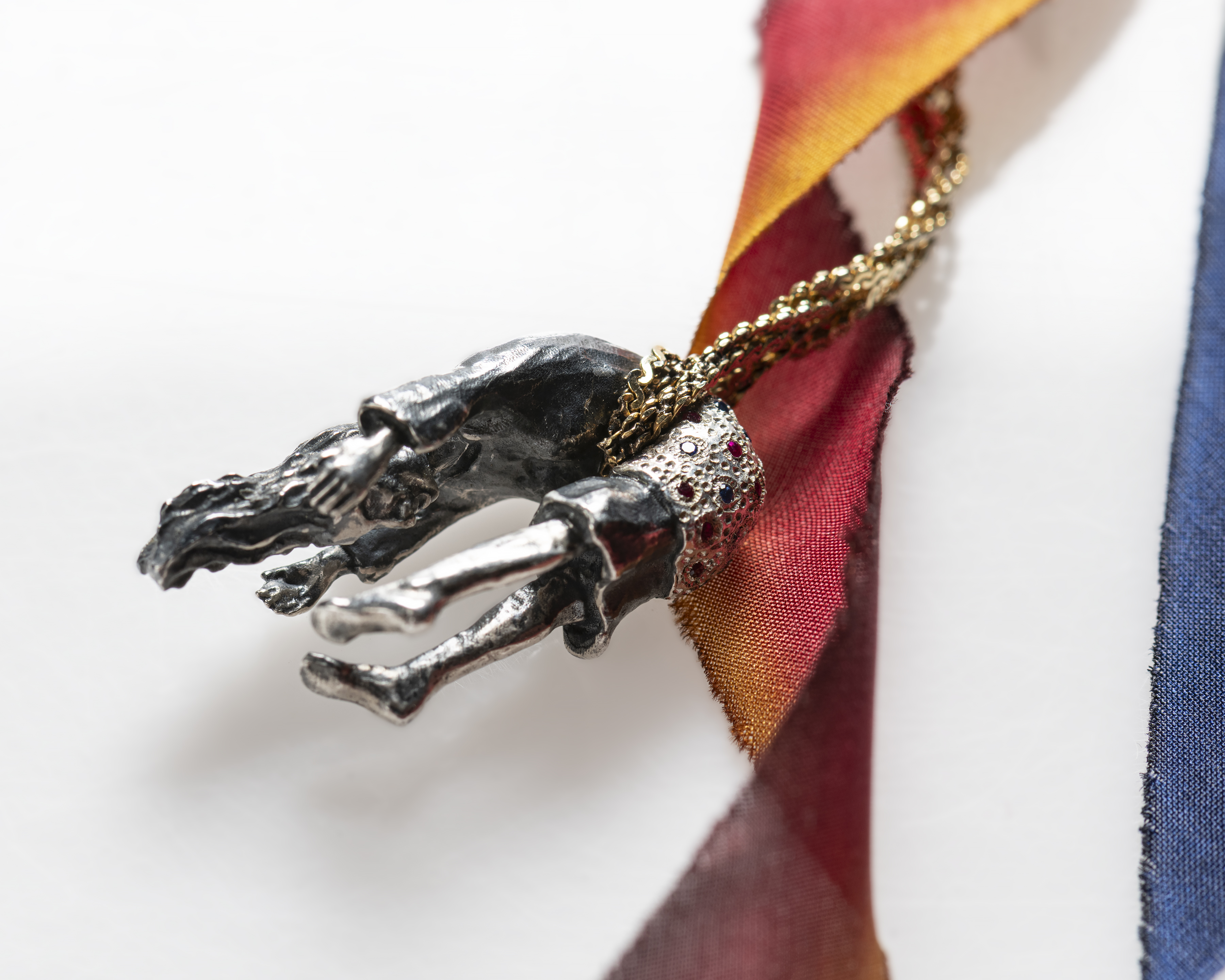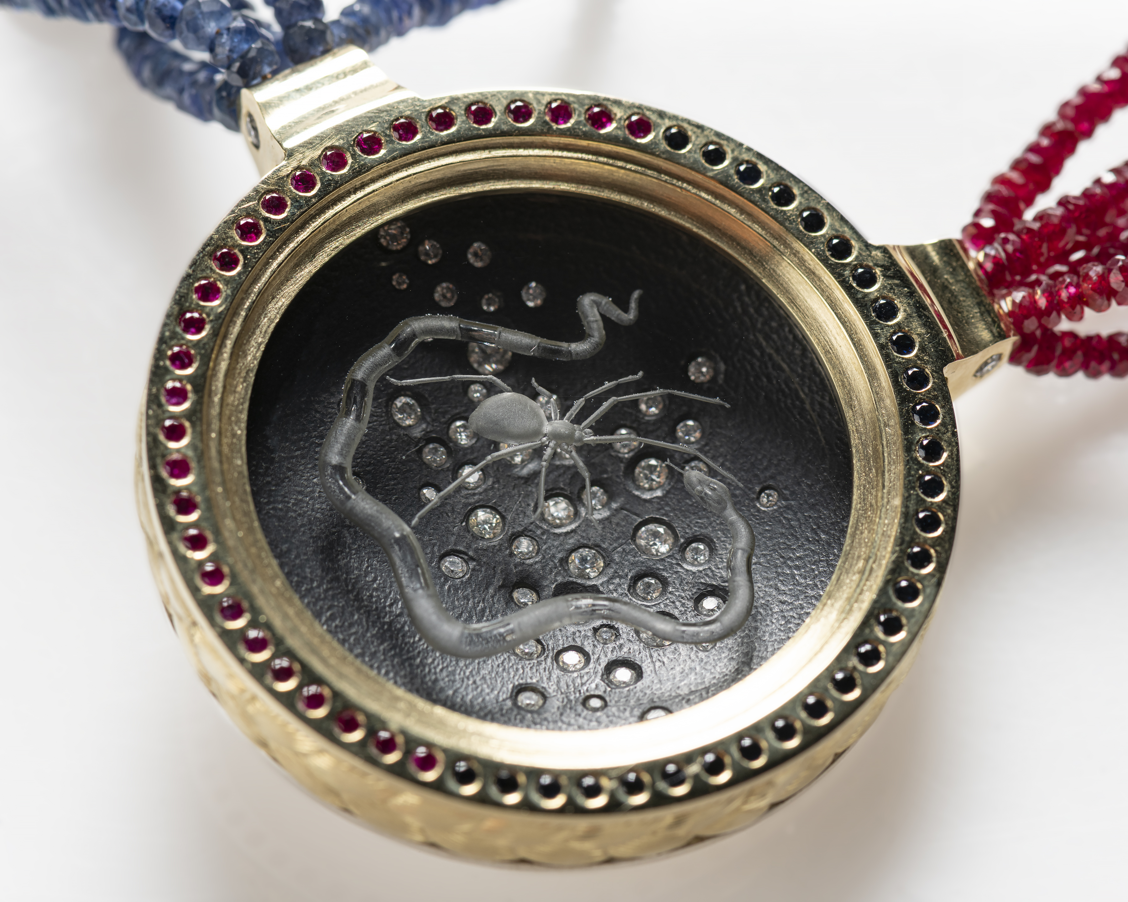 22k gold, 18k gold, sterling silver, sapphires, diamonds, quartz, brain tanned smoked buckskin, hand dyed silk, and rubies