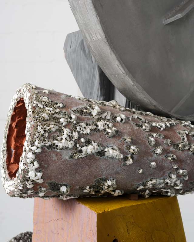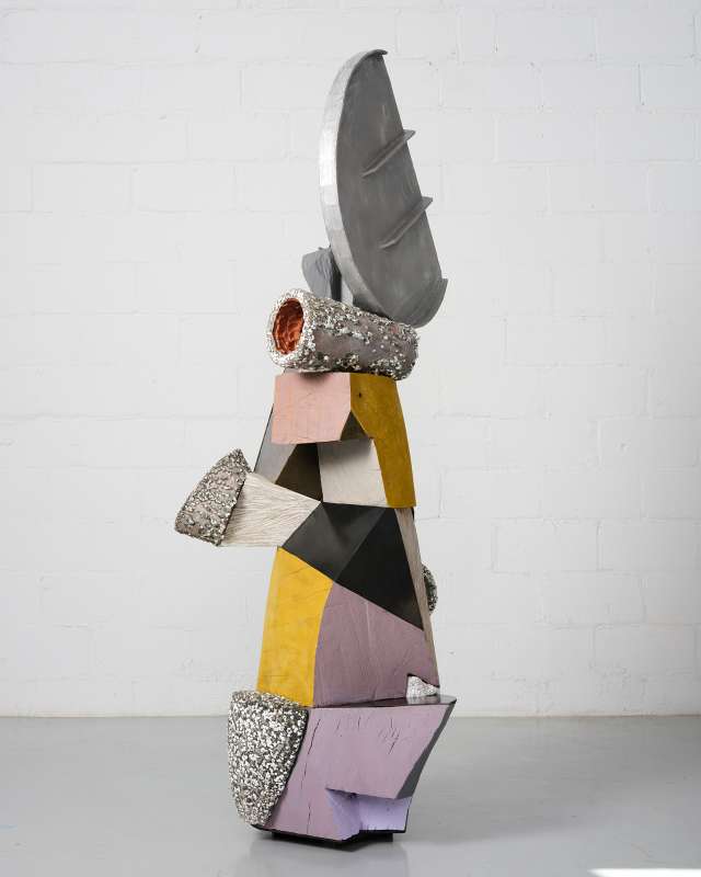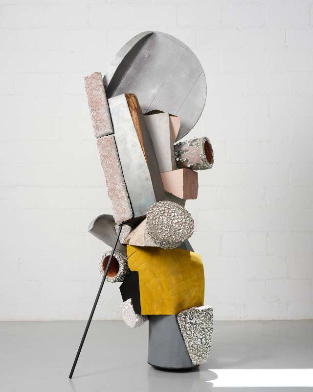 Glazed ceramic, painted and dyed hardwood, steel, cast aluminum