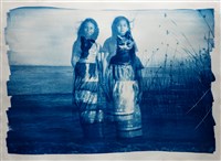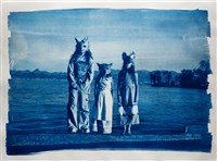 Cara Romero (Enrolled citizen of the Chemehuevi Indian Tribe), When Animals Were People (A Study), Untitled #3, 2025. Cyanotypes on archival paper, archival ink on silk organza.