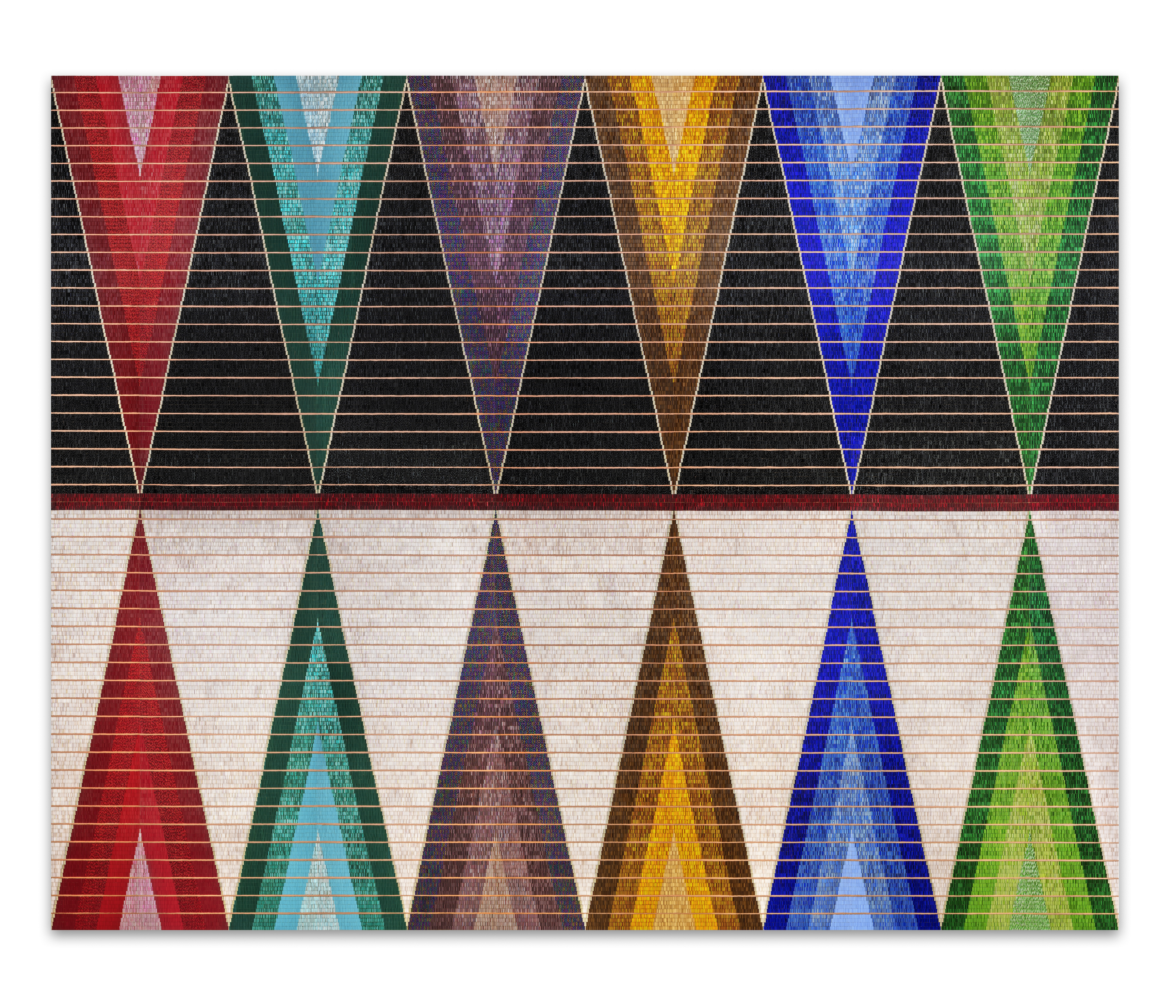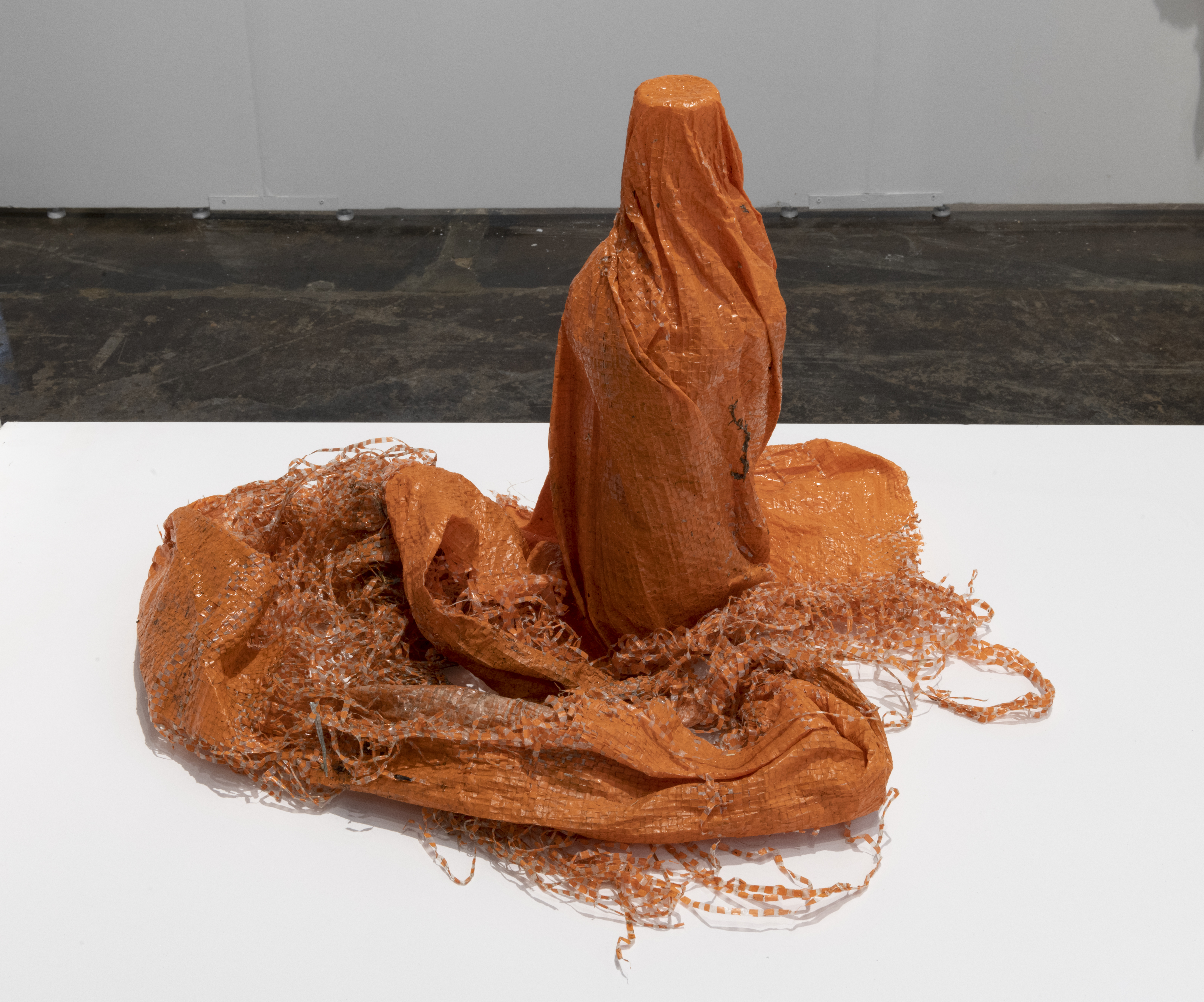 He coats the warp and weft until a field emerges (Orange upright bottle), 2021